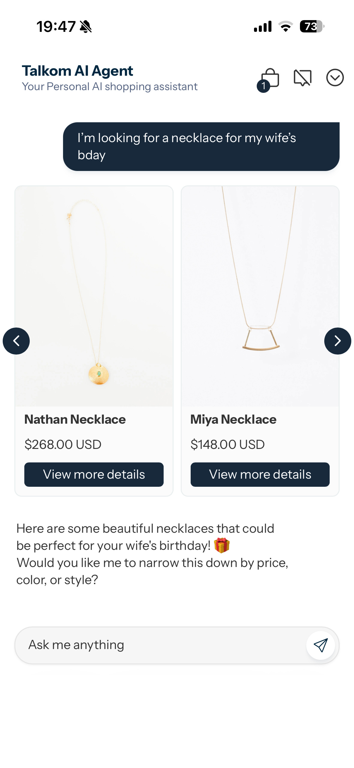 More than a chatbot. Talkom combines conversation with visual product browsing, explanations, and add-to-cart actions, creating a seamless shopping experience that drives engagement and higher conversion.